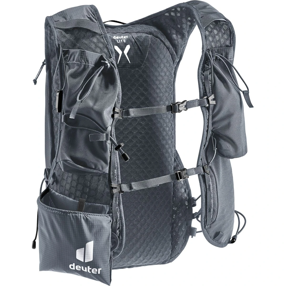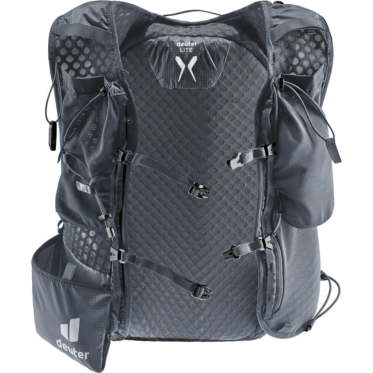 Leichtgewicht mit Komfort: ergonomische, westenförmige Schulterträger mit elastischem Kompressionsgurt, verstellbare Brustgurte und ein weiches Rückenmaterial lassen den Rucksack eng am Oberkörper anliegen. Zudem sorgen die Netzinnentasche und seitlichen Kompressionsriemen für eine Minimierung der Auf- und Abbewegung der Ladung beim Laufen. Die Holster-Stockhalterung am Schultergurt bietet schnellen Zugriff auf die Stöcke. Auch Softflask und GPS sind in den Taschen der Schulterträger stets griffbereit. Das Hauptmaterial des Trailrunnig-Rucksacks ist zu 100% recycelt und bluesign(R) zertifiziert.