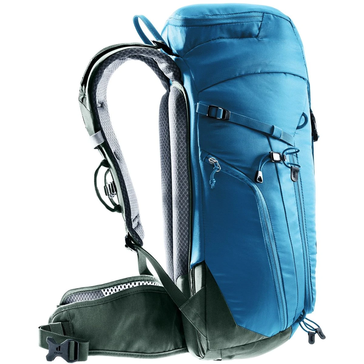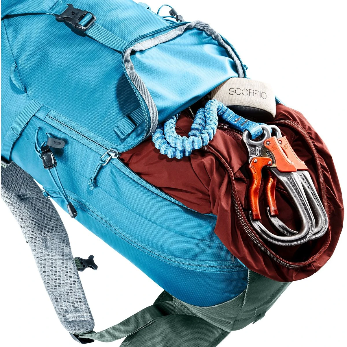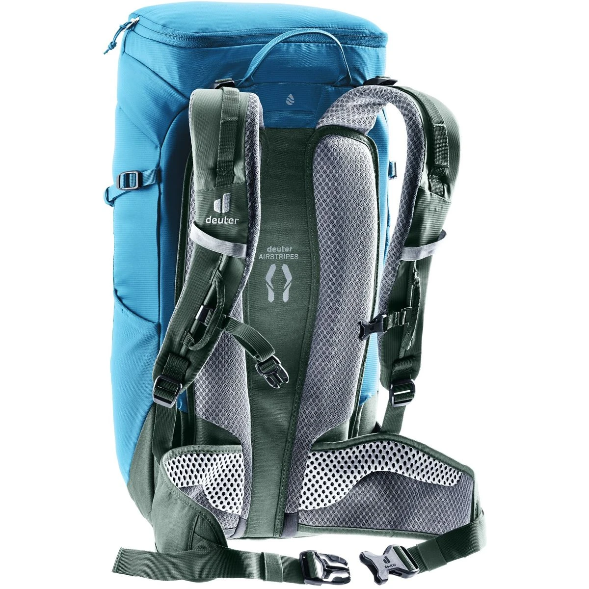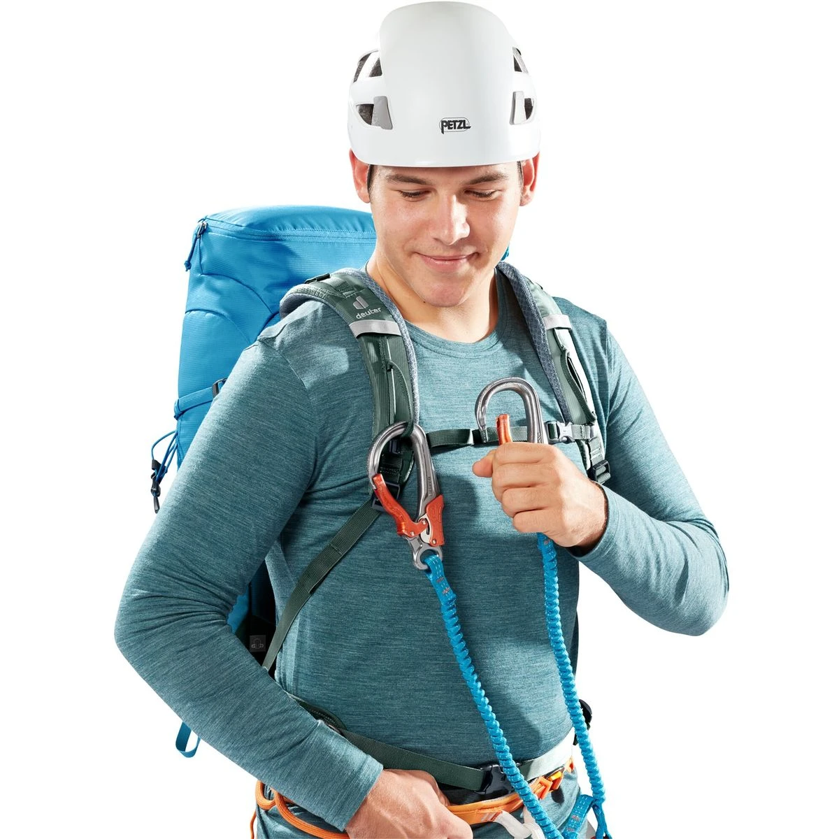 Das Airstripes Rückensystem mit geringer Rückenauflage und großen Belüftungskanälen sowie die perforierten Schulterträger und Hüftflossen sorgen für optimale Luftzirkulation, eine körpernahe Gewichtsverteilung und damit einen kompakten Sitz in jedem Terrain. Die flache Deckelkonstruktion bietet gute Kopffreiheit – auch mit Helm. Dank Fixierungen an den Schulterträgern sind die Karabiner des Klettersteigsets stets griffbereit. Zudem sind Ausrüstungsgegenstände und Material dank großem Reißverschluss-Frontzugang und Seitentaschen schnell zur Hand.
